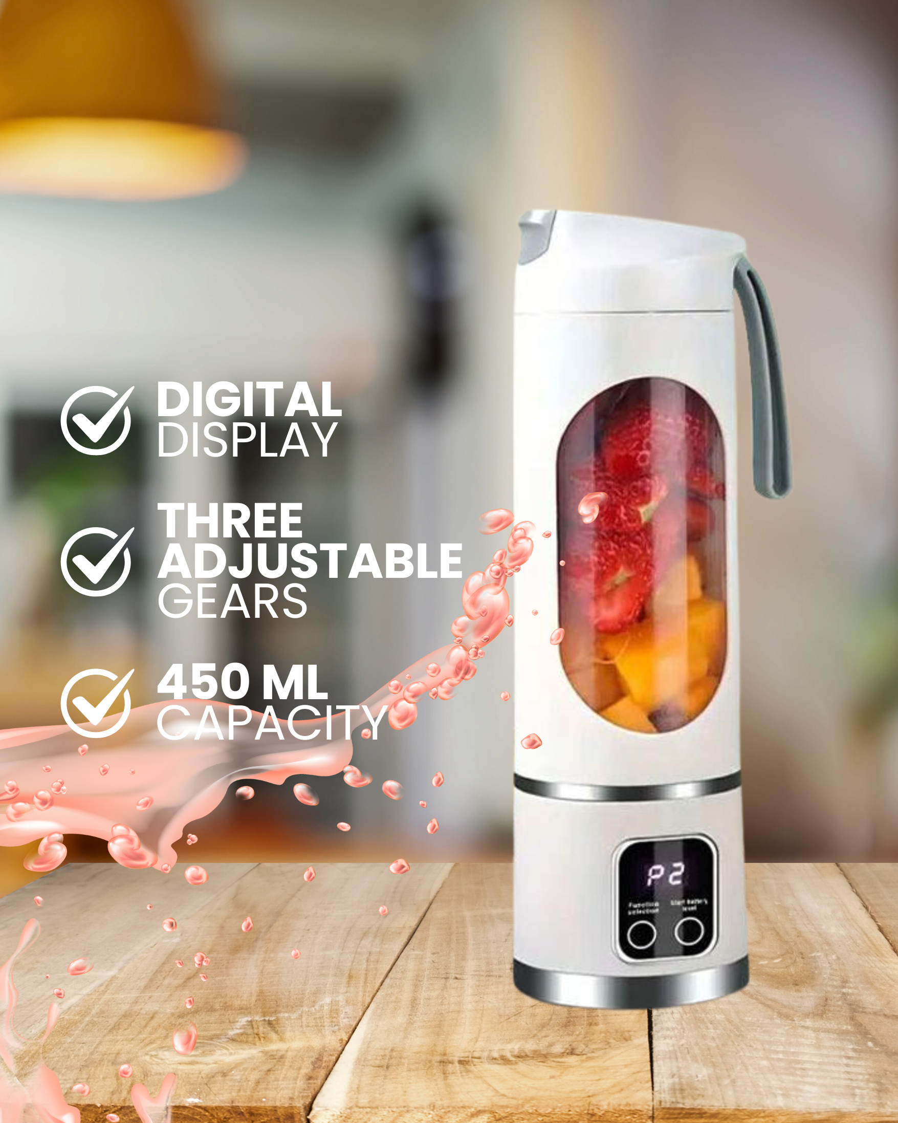 Product Title: SmoothGo Portable Blender | 8 Blades | 3 Speeds | USB Rechargeable | Ice Crusher Product Description: Tired of wasting time or missing out on your favorite healthy drinks when you're on the go? Discover the SmoothGo Portable Blender, your ultimate companion for health and convenience, anytime, anywhere! Designed for the modern pace of life, the SmoothGo™ combines power and portability to help you craft perfect shakes, smoothies, and juices in seconds. With its 8 ultra-sharp stainless steel blades, this blender not only effortlessly mixes fruits and vegetables but is also specifically engineered to crush ice with ease, ensuring deliciously cold and refreshing beverages even on the hottest days.
